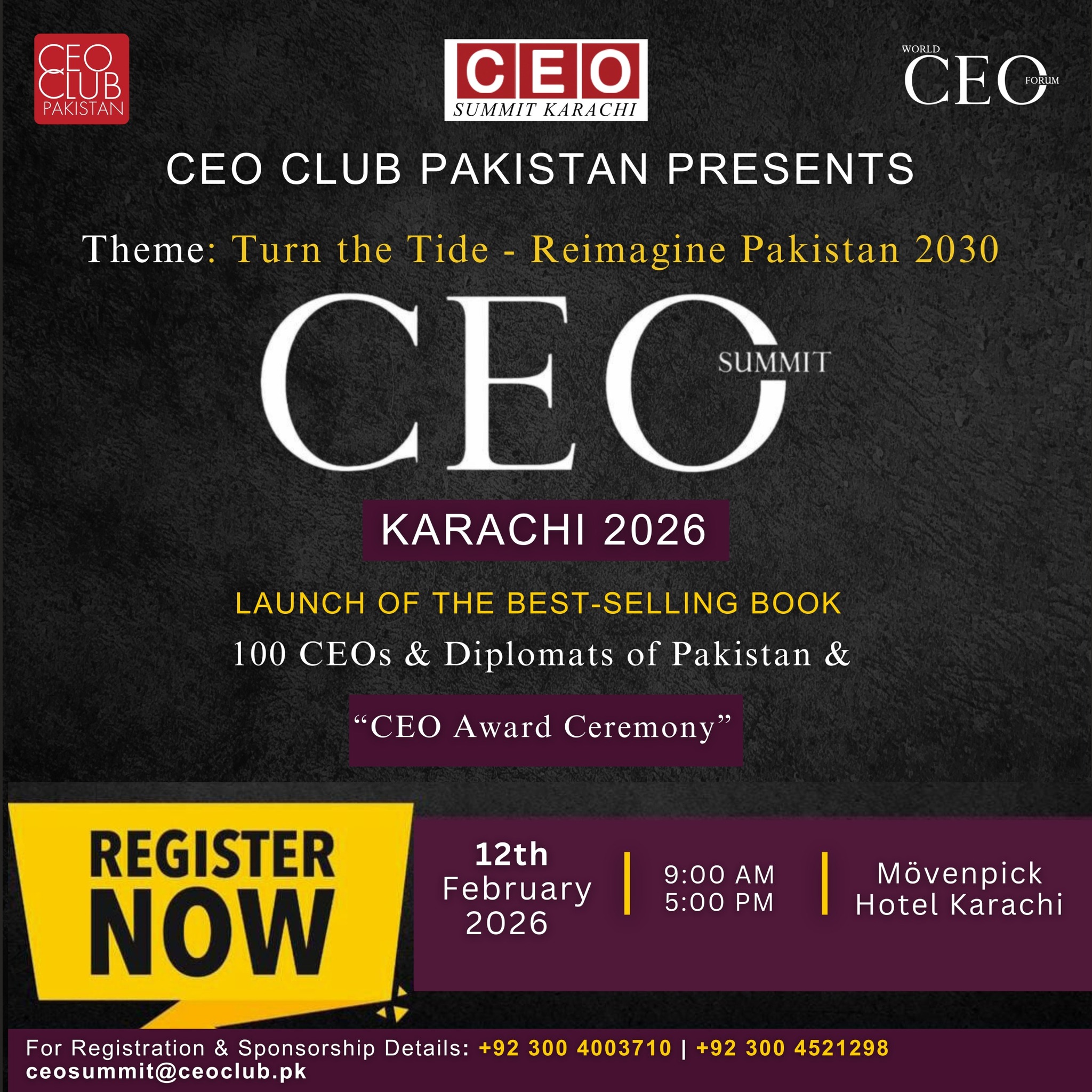 Get Ready for Pakistan’s Most Awaited Corporate Conference – CEO Summit Karachi by CEO Club Pakistan on Thursday 12th, February, 2026 from 09:00 am – 05:00 pm at Mövenpick Hotel, Karachi. The CEO Summi will highlight the theme Turn the Tide: Reimagine Pakistan 2030 and feature the launch of the book 100 CEOs & Diplomats of Pakistan along with the CEO Award Ceremony.